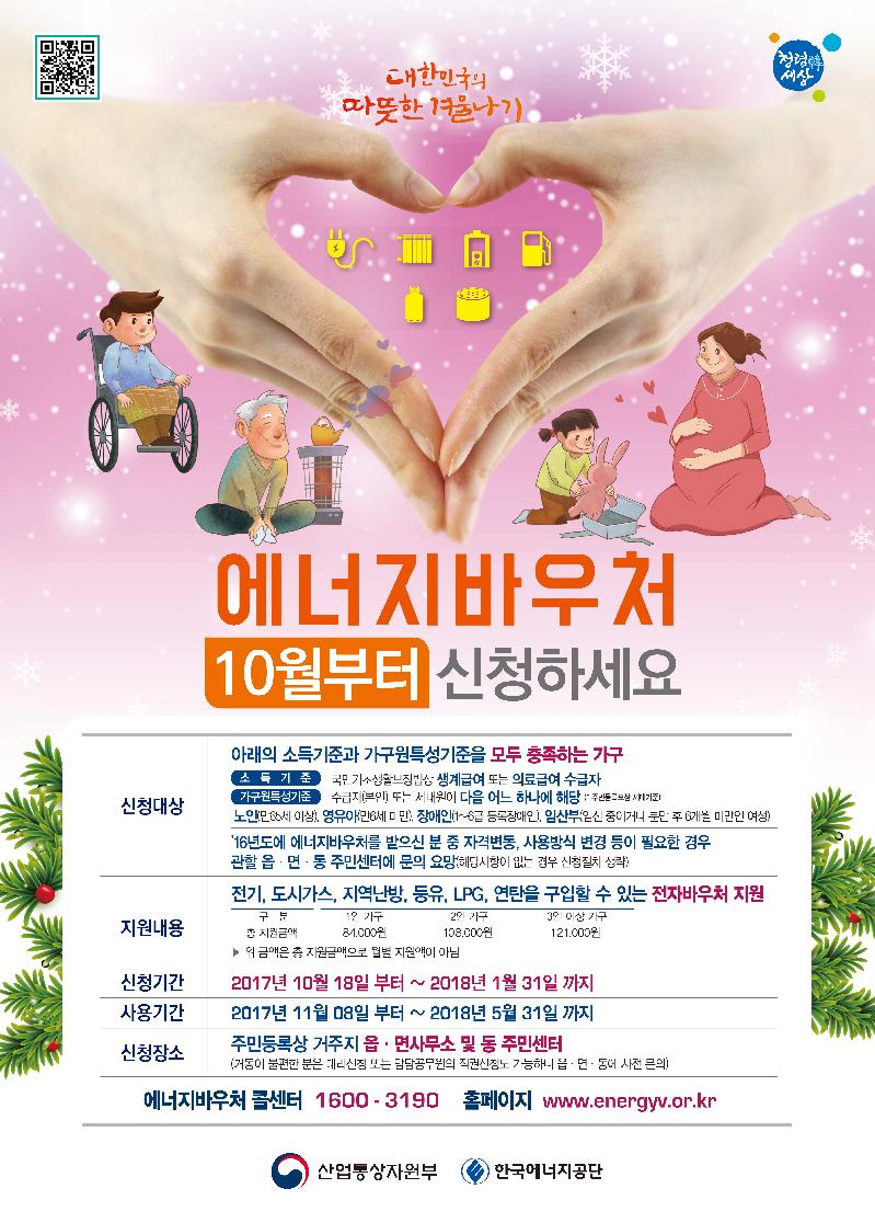 지원대상은 국민기초생활보장법상 생계급여 또는 의료급여 수급자 중 수급자 본인 또는 세대원이 만65세 이상의 노인이거나, 만5세 이하의 영유아 또는 1~6급 등록장애인, 임산부인 가구로, 18일부터 2018년 1월 말까지 거주지 읍·면·동주민센터에 신청할 수 있다.