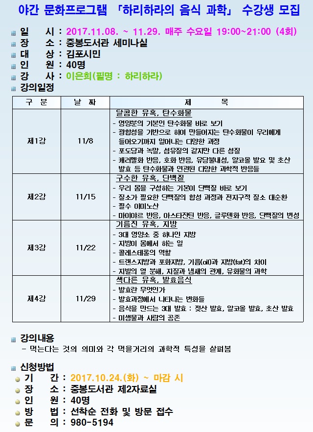 [미디어타임즈= 이옥수 기자] 김포시평생학습센터 중봉도서관이 야간 문화프로그램「하리하라의 음식 과학」을 11월 8일부터 11월 29일까지 매주 수요일(19:00~21:00) 4회 과정으로 운영할 계획이다.
