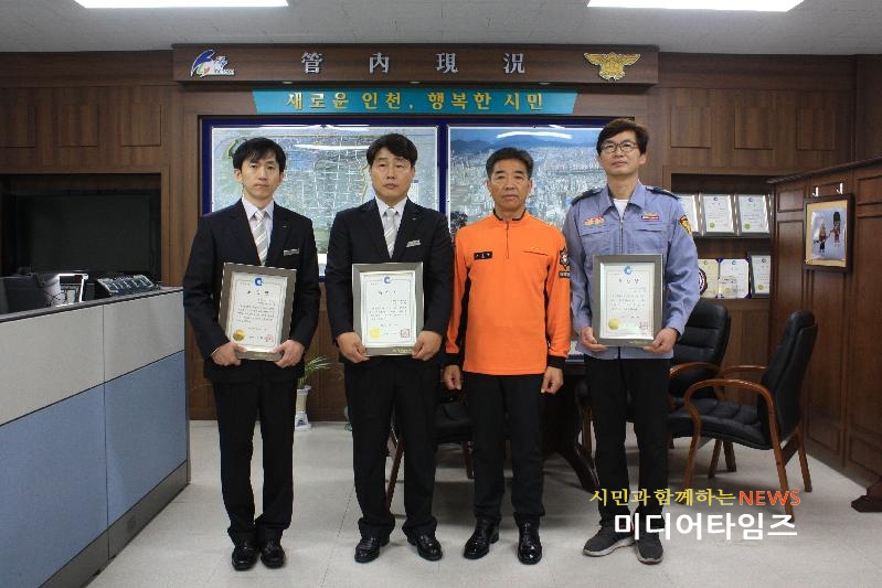 [미디어타임즈=문상수 기자] 인천부평소방서(서장 노경환)는 19일 오전 서장실에서 인천광역시 모범공무원 표창과 제53회 시민의 날 기념 모범 공무원·시민 3명에 대해 표창 전수했다.이 날 수상자로 인천광역시 시민의 날 표창에 최현철 소방교와 삼산남성의용소방대의 조용익 대원이, 모범공무원 표창에 최준환 소방장이 각각 인천시장상을 수상했다. 이어 시민의 날 표창을 받은 119구조대 최현철 소방교는 각종 재난현장에서 구조활동을 맡은바 묵묵히 수행하면서 사회 안전에 크게 기여하였으며, 삼산남성의용소방대 조용익 대원은 각종 안전문화 캠페인과 심폐소생술 교육, 봉사활동 등을 통해 지역사회 안전문화 조성에 기여하였다. 인천광역시 모범공무원 표창을 받은 갈산119안전센터 최준환 소방장은 화재 등 각종 재난현장에서 뛰어난 현장활동과 소방행정 발전에 기여하였다.노경환 부평소방서장은 “평소 성실한 자세로 업무에 임했던 만큼 좋은 결과로 수상하게 된 점을 축하한다”며“시민의 소중한 생명을 구하고 안전한 사회 분위기 조성에 노고를 치하하며 앞으로도 각자의 자리에서 최선을 다 해달라”고 전했다.
