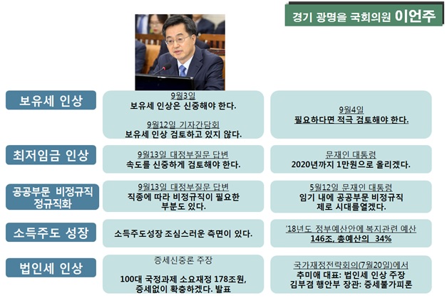 이의원은 “국민경제에 영향이 큰 경제정책에 대해 발표 때는 방관하다가 추진과정에서 딴소리를 내고 있다.” 며 “이는 소위, 김동연 패싱 논란을 잠재우기 위한 오버액션은 아닌지 의구심이 든다.” 며 국민을 더 이상 실험하지 말고 경제정책컨트롤타워로서 소신 있게 일할 것을 촉구했다.