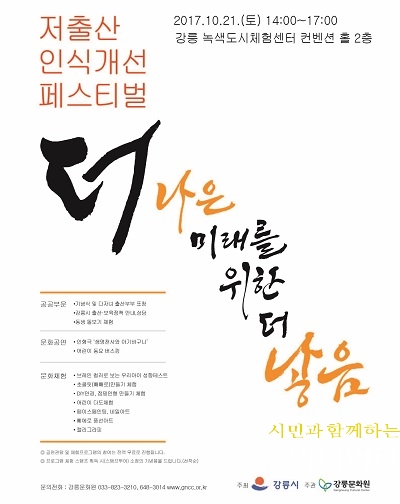 [미디어타임즈= 김형기 기자] 강릉시가 주최하고, 강릉문화원이 주관하는 「저출산 인식개선 페스티벌」이 오는 21일(토) 오후 2시 강릉녹색도시체험센터 컨벤션홀 2층에서 ‘더 나은 미래를 위한 더 낳음’이라는 주제로 개최된다.