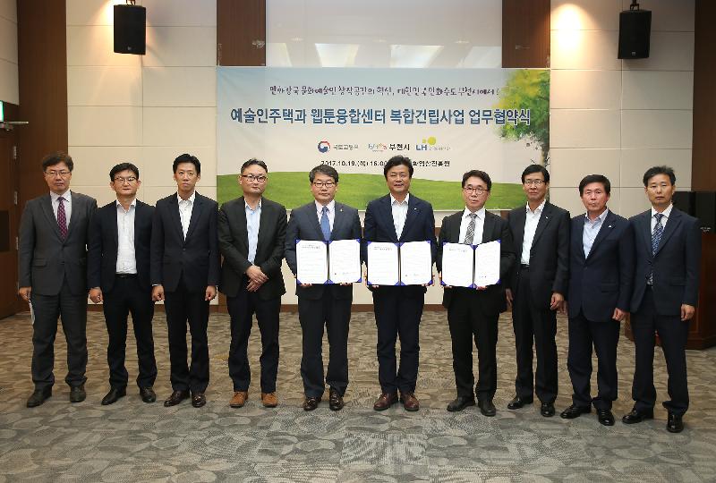 부천시는 19일 국토교통부, 한국토지주택공사(LH)와 ‘예술인주택과 웹툰융합센터 복합건립사업’을 위한 업무협약을 체결했다.