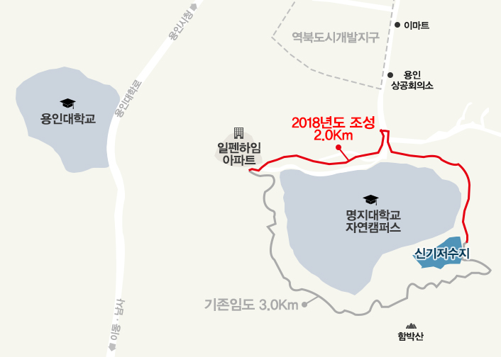 우선 임도 둘레길은 명지대 후문 엘펜하임 아파트 인근부터 신기저수지까지 3km 구간에 조성된 기존 임도를 명지대학교 캠퍼스 경계 숲길을 따라 2km 연장해 순환할 수 있도록 잇는다.