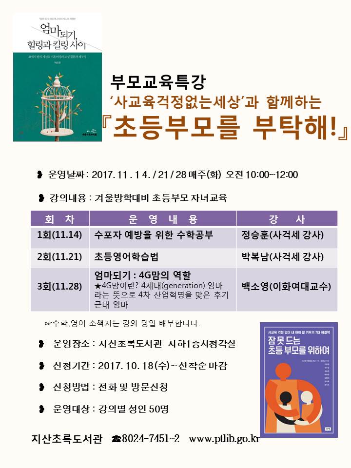 “초등부모를 부탁해!”는 오는 11월 14일~28일 매주 화요일 오전10시 총3회로 운영되며 수학, 영어 강의 소책자도 배포한다. ‘잠 못 드는 초등부모를 위하여’, ‘엄마되기:힐링과 킬링사이’등 관련도서들도 전시할 예정이다.