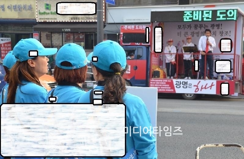 10.28 재보궐선거 광명시 경기도의원 모 후보 유세 현장에 상대후보 선거운동원이 갑자기 나타나서 유세활동이 잠시 중단되는 불상사가 일어났으나 잠시후 어떤 휴대전화를 받고나서 자리를떠났다.