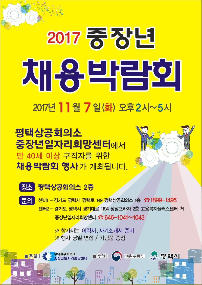 평택상공회의소 중장년일자리희망센터의 주최로 고용노동부, 평택시 후원하여 진행되는 이 날 중장년 채용박람회 행사는 경기남부권역의 40세 이상 장년층 구인 기업 20여개 업체가 참여하여, 장년층 일자리 지원에 나설 계획입니다.