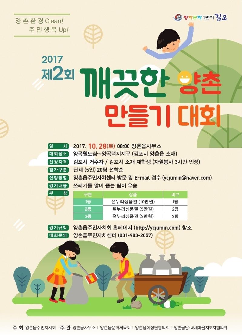 “깨끗한 양촌 만들기 대회”는 일본에서 개최되는 스포츠 쓰레기 줍기 대회에서 아이디어를 얻은 것으로 5명이 팀을 이루어 출전하는 단체전으로 진행된다. 단체 참가자는 선착순 20팀까지 참가 가능하며, 단체전과 개인전으로 나뉘어 진행됐던 1회 때와는 달리 이번 대회에서는 단체전만 진행된다.