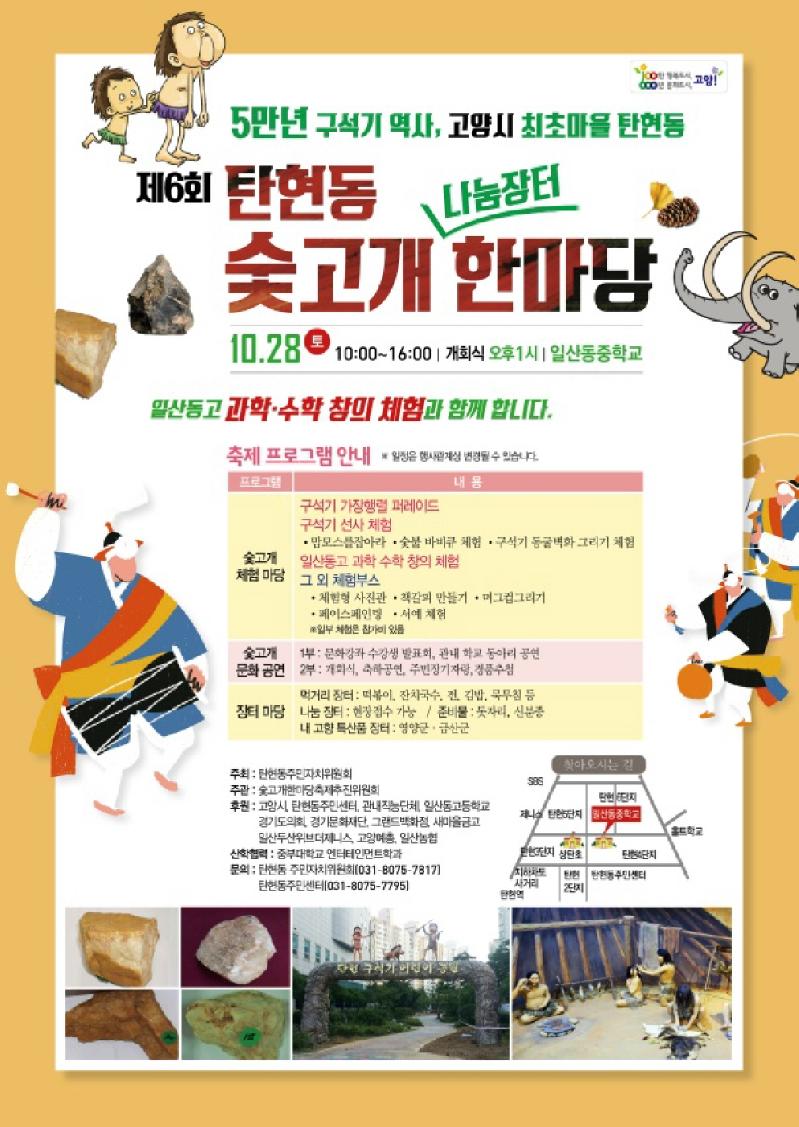 [미디어타임즈= 이옥수 기자] 고양시(시장 최성) 탄현동은 오늘 28일 일산동중학교에서 ‘5만 년 전 구석기 역사, 고양시 최초마을 탄현동’의 테마로 ‘제6회 탄현동 숯고개 한마당’ 축제를 개최한다.