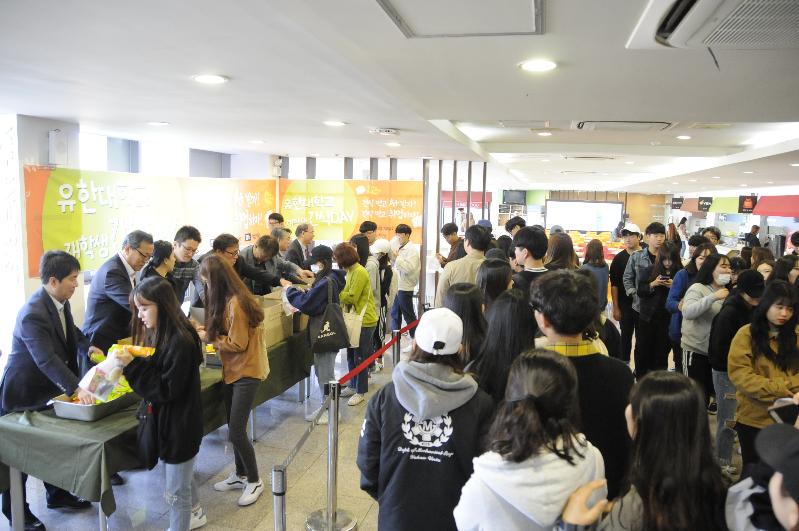 이날 행사에는 이권현 총장 및 주요 보직자들이 직접 간식꾸러미를 일일이 재학생들에게 나눠줘 더욱 의미가 컸으며, 간식데이 이벤트 행사 시작 15분 만에 700인분의 간식꾸러미가 순식간에 동이 났다.
