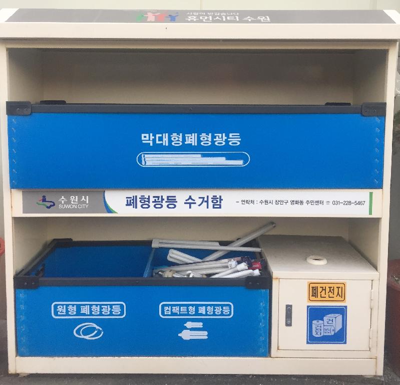 수원시는 42개 동 주민센터와 도서관, 아파트 등에 자체 제작한 폐건전지·폐형광등 수거함을 설치해 시민들의 분리 배출을 돕고 있다. 종이팩은 깨끗이 씻어 말린 후 동 주민센터로 가져가면 화장지로 교환해 준다(200㎖ 100개당 화장지 1롤).