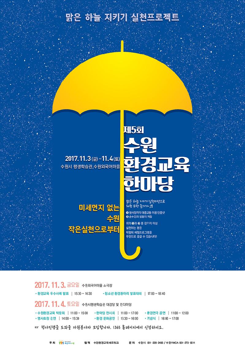 수원시 주최, 수원환경교육네트워크 협력으로 열리는 이번 행사는 ‘맑은 하늘 지키기 프로젝트’를 슬로건으로, 미세먼지 없는 도시를 만들기 위한 시민 실천미션 수행, 환경교육박람회, 전문가 강연 등 다채로운 프로그램을 선보인다.