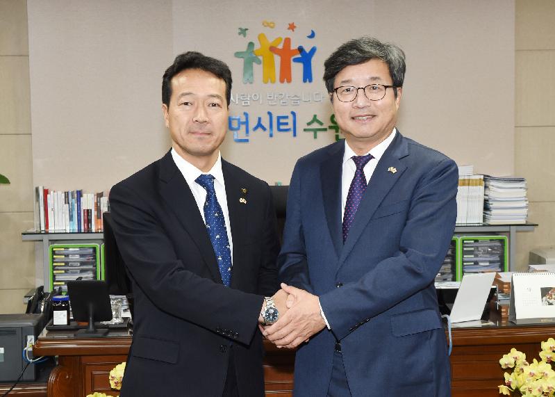 [미디어타임즈= 김광한 기자] 염태영 수원시장이 31일 집무실에서 니시카와 마사히토 일본 아사히카와시장을 만나 2019년 아사히카와시에서 열릴 예정인 ‘자매도시 결연 30주년 기념행사’ 등 양 도시 간 교류 활성화 방안에 대해 논의했다.