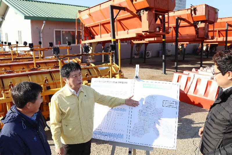 정 시장은 이 자리에서 제설제 살포기와 제설삽날 등 제설장비 관리실태를 점검하고 친환경 제설제나 염수 등 자재확보 현황을 확인했다.