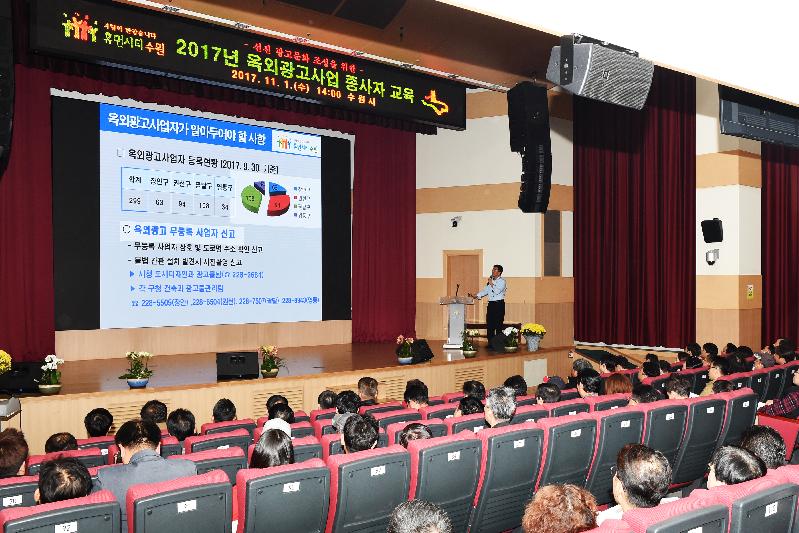 수원시는 1일 시청 대강당에서 옥외광고사업자 300여 명을 대상으로 ‘옥외광고문화 선진화를 위한 교육’을 하고, ‘옥외 광고물 등의 관리와 옥외광고산업 진흥에 관한 법률’을 알기 쉽게 설명했다.