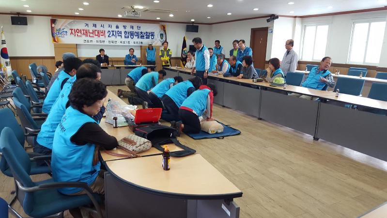 박재운 단장과 40여명의 단원이 참석한 가운데 장목면사무소에서 심페소생술 교육을 실시한 후, 장목면 황포마을 일원 국도58호선에 설치된 제설함에 준비한 모래주머니를 비치하고 도로사면 등 위험지역 예찰활동을 실시했다.