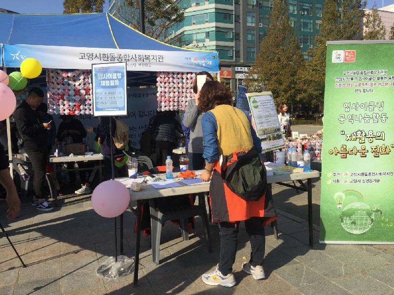 특히 10월 28일에는 일산문화공원에서 개최된 ‘2017 고양시민 사랑나눔 한마당’에 참여해 땡쓰 에코맘’ 사업의 2017년도 작품 전시 및 체험활동을 진행했다.
