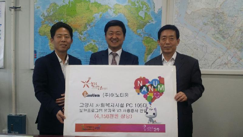 이날 이노티움에서 기증한 ‘발자국V3’는 랜섬웨어 방어 및 보안 백업 프로그램(4,158천원 상당)으로 고양시 관내 사회복지시설 5개소에 설치돼 있는 PC 총 105대에 설치될 예정이다.