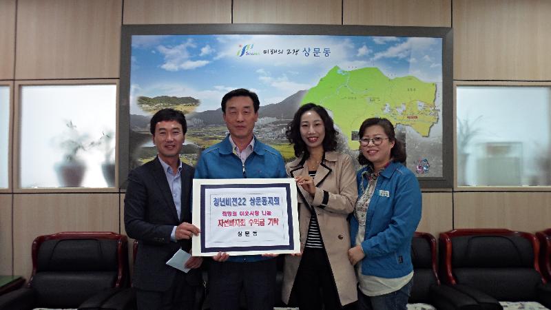 청년비전22 상문동지회(지회장 김규동)는 어려운 이웃들에게 전달해달라며 자선바자회 수익금 163만원을 상문동(동장 옥윤석)에 기탁했다.