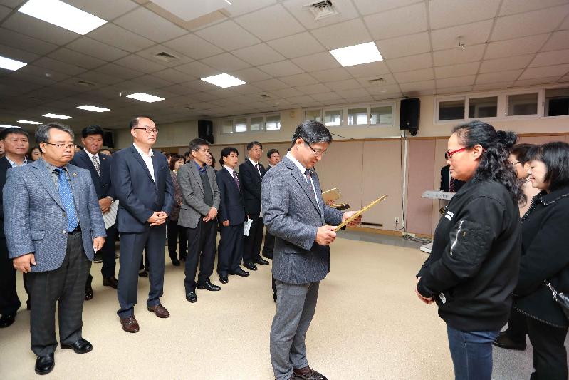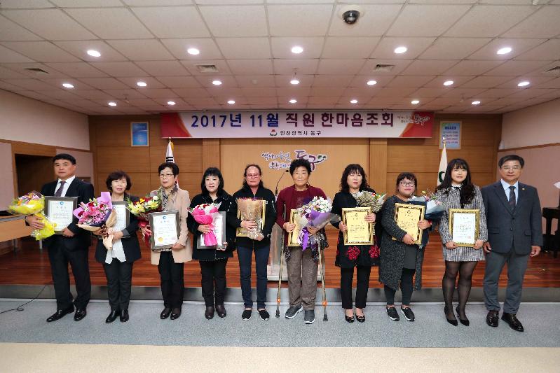 [미디어타임즈=문상수 기자] 인천 동구(구청장 이흥수)는 6일, 구청 지하 대회의실에서 전 직원과 함께 하는 11월 전직원 한마음 조회를 개최했다. 이날 월례조회에서는 국민의례를 시작으로 반상회 유공자, 모범·친절 공무원, 모범선행시민에 대한 표창 수여식이 진행됐으며 이어 이흥수 동구청장의 훈시말씀이 이어졌다.이날 이 구청장은 “지난 4일 개최된 제28회 구민생활체육대회를 성공적으로 마칠 수 있도록 열심히 준비한 직원 여러분과 동구체육회, 각 동장님과 주민자치위원, 통장님들을 비롯한 모든 주민 여러분께 감사드린다”고 전했다. 또한“우리 구 동절기 핵심사업인 스케이트장, 성탄트리, 송현공원 빛조명 사업의 성공적 추진을 위해 직원 여러분들이 더욱 열정을 갖고 업무에 임해주기 바라며, 연말 주요사업들이 계획대로 마무리 될 수 있도록 업무추진에 철저를 기하여 주시길 바란다”고 당부했다.
