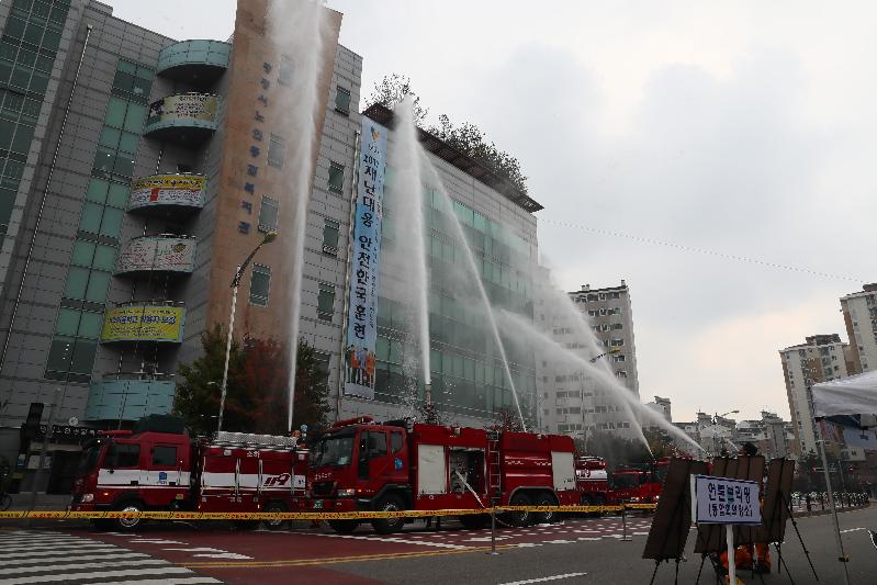 소하동 노인종합복지관 대형화재와 바람으로 인한 불씨가 한내 근린공원으로 번져 화재가 발생하는 상황을 가상한 현장 훈련은 재난안전대책본부 가동, 수습 및 복구 활동에 이르기까지 유관기관 단체의 협조체제를 점검하고 위기대응 능력과 안전의식을 높이는 데 중점을 두고 실시됐다.