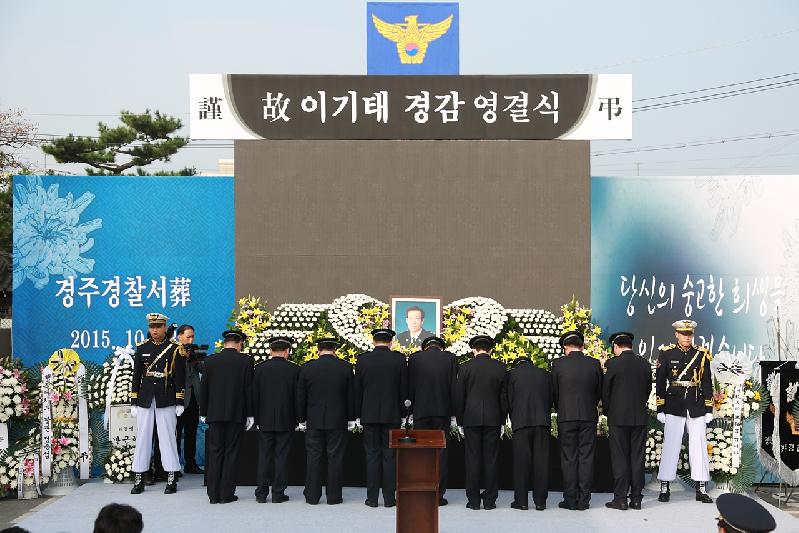 경주경찰서(서장 오병국)는 23일 오전 8시 30분 경주경찰서 내에서 10. 21. 경찰의 날 철길에 뛰어든 장애인을 구하려다 숨진 故 이기태경감의 영결식을 경주경찰서 葬으로 거행했다.