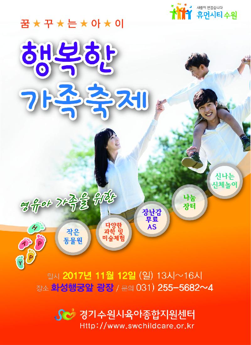수원시육아종합지원센터가 주관하는 이번 축제에서는 ▲육지거북·타조·앵무새 등 20여 종의 동물을 코앞에서 만날 수 있는 작은 동물원 ▲가족이 함께 즐기는 편백놀이터 ▲과학·만들기·샌드아트 체험 코너 ▲에어바운스 등 신나는 신체활동 코너 ▲소방서 안전체험 등 영유아들이 엄마아빠와 함께 참여할 수 있는 다채로운 체험 부스가 운영된다.
