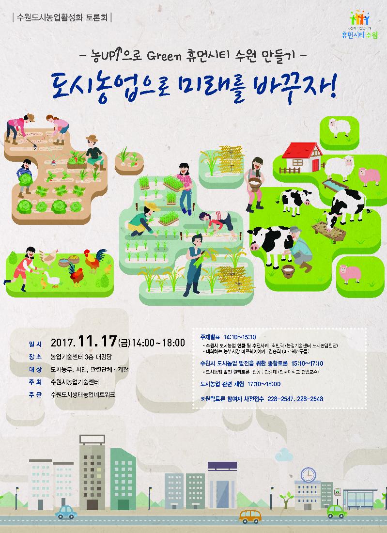 수원시는 오는 17일 오후 2시부터 4시간 동안 수원시농업기술센터 3층 대강당에서 ‘수원도시농업활성화 토론회’를 연다.