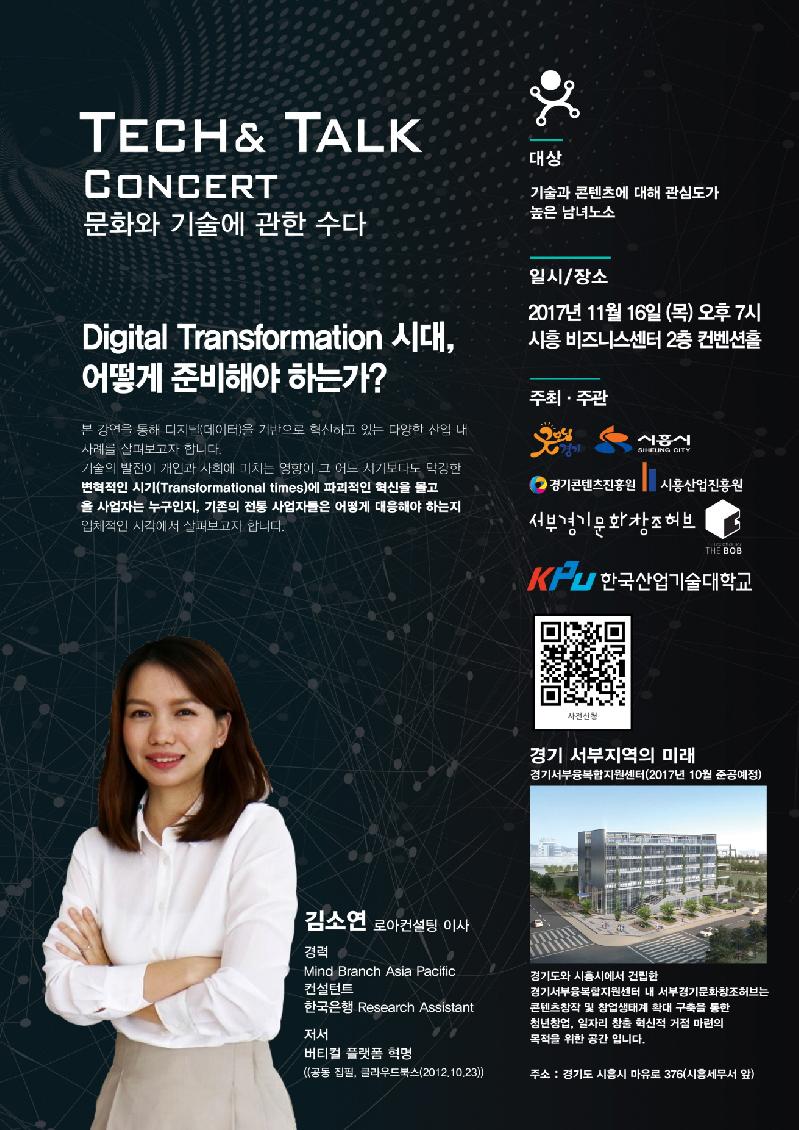 이번 세 번째 Tech & Talk 콘서트는 11월 16일 오후 7시부터 시흥비즈니스센터 2층 컨벤션 홀에서 개최하며, 로아컨설팅의 김소연 이사를 연사로 초청하여 ‘Digital Transformation 시대, 어떻게 준비해야 하는가?’ 라는 주제로 진행한다. 김소연 이사는 기존의 전통 제조업자들은 어떻게 대응해야 하는지에 대해 입체적인 시각에서 살펴보고, 디지털로 혁신하지 않으면 도태되는 환경에서 데이터를 기반으로 혁신하고 있는 다양한 산업 내 사례 중심으로 강연할 예정이다.