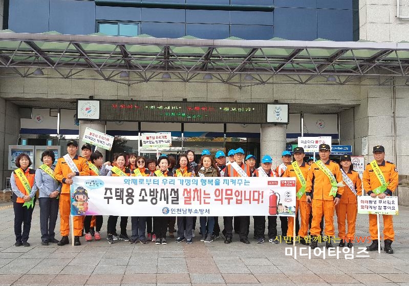 [미디어타임즈=문상수 기자] 인천남부소방서(서장 류환형)는 ‘2017 전국 불조심 강조의 달’을 맞아 지난 10일 인천종합터미널 앞에서 소방공무원, 의용소방대, 남구노인인력개발센터(소방안전지원사업단) 등 70여명이 참석한 가운데, 시민을 대상으로 안전문화 확산을 위한 화재예방 캠페인을 실시했다.캠페인의 주요 내용으로는 비상구 등 피난통로 확보를 위한 ‘비상구는 생명의 문’, 골든타임 확보를 위한 ‘소방차 길터주기’, 주택 내 기초소방시설 설치로 주택화재 피해를 최소화하기 위한 ‘우리집 소화기 1개, 경보기 1개는 생명을 9합니다.’ 가 쓰여진 플래카드를 내걸고 피켓과 어깨띠를 활용하여 실시하였다.소방서 관계자는 “불조심 강조의 달을 맞아 화재예방활동에 총력을 기울이고 있는 만큼, 국민들이 참여하여 자율적 화재예방 실천 환경이 조성될 수 있도록 모두가 관심을 가져줄 것”을 당부했다.