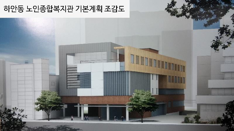 하안동 노인종합복지관은 지하 2층, 지상 3층 연면적 5443㎡로 경로식당, 체력단력실, 물리치료실 등 고령화 시대에 맞는 맞춤형 여가시설이 들어선다.
