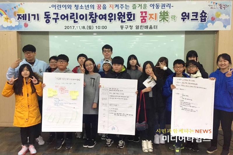 [미디어타임즈=문상수 기자] 인천 동구(구청장 이흥수)가 지난 18일, 구청 4층 열린배움터에서 ‘2017년 제1기 어린이 참여위원회 제5차 꿈지락 워크숍’을 개최했다. 구에 따르면, 지난 7월 처음 구성된 어린이 참여위원회는 어린이들이 자신과 관련된 정책에 대하여 자유롭게 의견을 내고 참여할 수 있는 기회를 보장하며 아동친화도시 동구를 조성하는데 기여하고 있다.이날 워크숍에서는 어린이참여위원들이 지난 9월 직접 관내 현장을 방문해 어린이의 눈높이로 개선이 필요한 장소를 찾아보았던‘사진으로 보는 동구’자료를 바탕으로, 보행권을 침해하는 불법 주차와 적치물, 무단투기 쓰레기, 방치된 폐가 등 어린이에게 위험한 시설 등에 대한 문제점과 개선방안을 논의해 정책제안서를 만들었다. 이날 작성한 정책제안서는 다음 달 있을 어린이 참여위원회 수료식에서 구청장에게 전달할 계획이다.구 관계자는 “구는 지속적으로 어린이들이 구정에 참여해 아동의 의견이 정책에 반영되는 아동친화적인 행정을 펼쳐 나가겠다.”고 말했다.