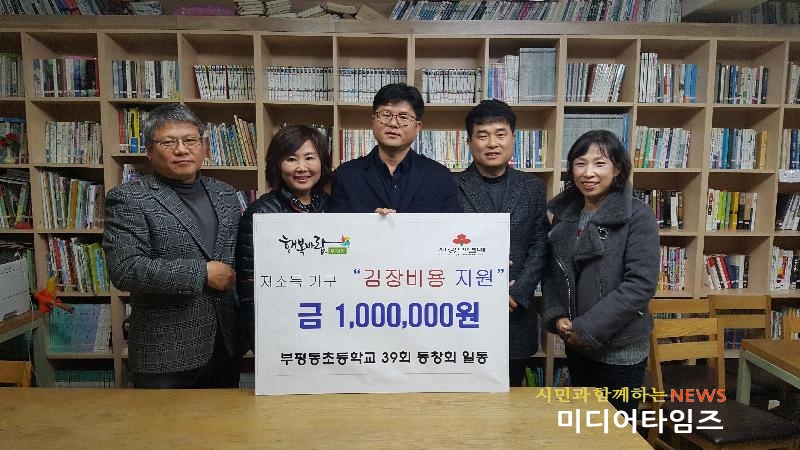[미디어타임즈=문상수기자] 인천부평구 부평동초등학교 39회 동창회는 지난 17일 동절기를 앞두고 있는 소외계층을 위해 맛있는 김장을 담가 전달할 수 있도록 부평구(구청장 홍미영) 부평4동 새마을부녀회에 김장비용 100만원을 기탁했다. 부평동초등학교는 부평4동 관내에 위치한 공립학교로 개교한지 70년이 넘은 유서 깊은 학교다.부평동초 39회 이성열 동창회장은 “김장나눔 행사에 동참할 수 있는 기회가 주워져 매우 기쁘다”며 “앞으로도 지역의 어려운 이웃들을 위해서 적극 봉사활동에 참여하겠다”고 밝혔다. 김동연 부평4동 새마을부녀회장은 “날씨마저 추워지는데 주위의 무관심으로 더욱 추운 겨울을 보내게 될 우리의 저소득층 불우이웃을 위한 김장나눔 행사에 지역 초등학교 동창회가 함께 해줘 진심으로 감사하다”고 말했다.