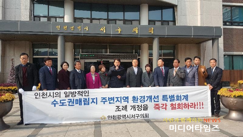 [미디어타임즈=홍기연 기자] 인천시에서 입법예고한 ‘수도권매립지 주변지역 환경개선 특별회계 설치 및 운용조례 개정(안)’에 대해 인천시 서구의회(의장 심우창)가 규탄에 나섰다.그동안 서구의회는 쓰레기로 인한 우리 구민의 피해보상과 권리를 지키기 위해 수도권매립지 반입수수료 가산금 서구청 특별회계 편성 촉구 결의안 의결 및 행정안전부와 인천시를 항의 방문 하는 등 매립지특별회계의 서구 전입을 위해 노력해 왔다.지난 13일 서구 전체 의원 간담회에서 조례 개정 반대 입장 표명에 이어 17일 인천시의회 산업경제위원회(위원장 김정헌) 소속 의원 및 인천시 기획조정실장(이용철)과의 면담에서 수도권매립지 특별회계 재원의 당초 사용목적인 서구민의 환경개선 사업추진에 사용해야 하는 근본취지를 되짚으며 이번 개정 조례(안)에 대한 인천시의 부당성을 지적했다.또한, 개정 조례(안)을 입법예고하기 전에 이런 중대한 사안을 52만 서구민의 대의기관인 인천시 서구의회 및 서구청과의 충분한 소통이 이뤄졌어야 한다고 주장했다. 이에 서구의회는 20일 제221회 서구의회 제2차 정례회 제1차 본회의 종료 후 의회동 앞에서 인천시의 부당한 행위에 대한 성명서를 발표하고 조례 개정(안)을 즉각 철회토록 서구 전체 의원이 참여한 가운데 규탄대회를 열었다. 서구의회 전체 의원들은 ‘인천시는 수도권매립지 주변지역 주민의 건강을 담보로 하여 받은 폐기물 반입수수료 가산금(수도권매립지 특별회계 재원)을 서구에 직접 교부토록 하며, 조례 개정(안)이 철회될 때까지 계속해서 항거할 것이다’ 라고 강력한 반대 입장을 전했다.
