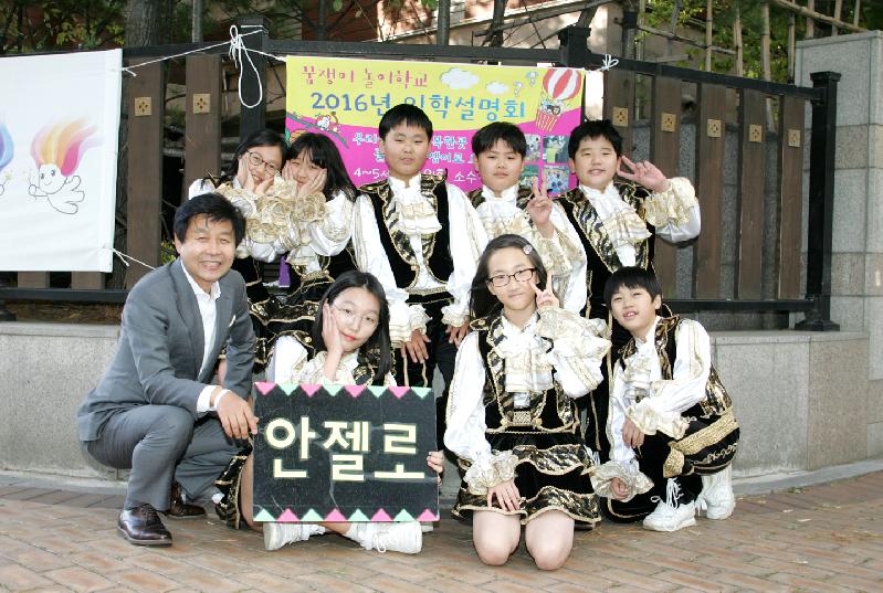 | 나상성 광명시의회 의장이 광명5동 현진아파트와 월드메르디앙아파트 사이도로에서 열린 '울동네조금느린축제' 개회식에서 공연한 ‘안젤로’ 초등학교 치어리더팀과 기념사진을 찍고 있다. |