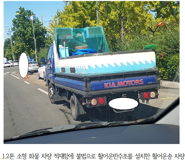 | 1.2톤 ㅅ소형화물차량 적재함에 불법으로 활어운반수조를 설치한 활어 운송차량 사진. <ⓒ미디어타임즈> |