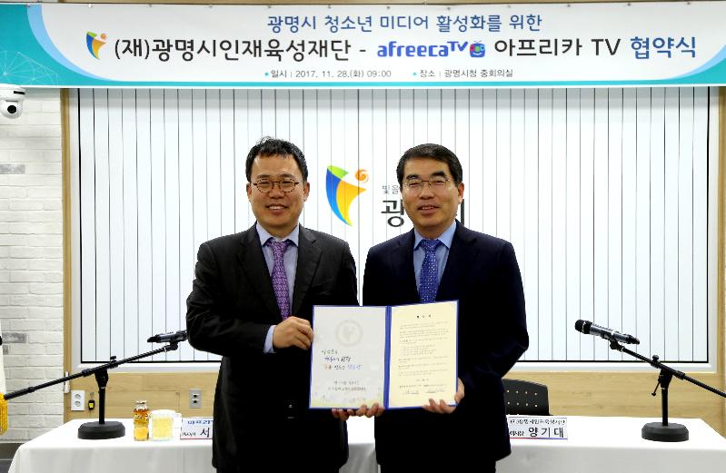 양기대 (재)광명시인재육성재단 이사장은 “이번 협약으로 광명시와 아프리카 TV(대표이사 서수길)가 상호 협력하여 청소년들이 다양한 방송관련 직업을 전문적으로 체험하고 청소년들이 1인 미디어 시장의 영향력을 확대하는 기회를 마련했으면 좋겠다” 밝혔다.