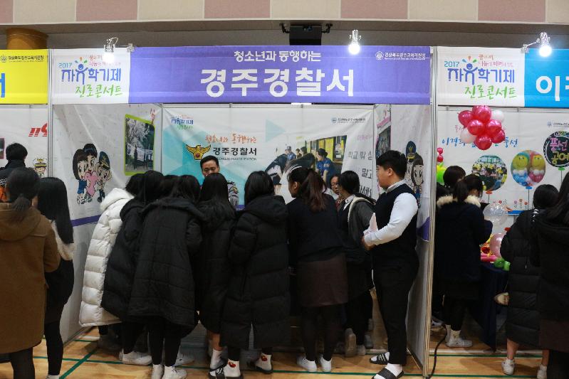 경주경찰서(서장 양우철)는 2017. 11. 29.(수) 경주교육지원청에서 주관하는 ‘2017 자유학기제 진로 콘서트’에 참여, 경찰 부스를 운영하였다. 이번 진로 콘서트는 ‘행복한 인재 육성’ 비전을 가지고 1년간의 자유학기제 운영 성과 발표회와 진로체험처 체험 행사를 운영하였으며 행사에는 관내 중학교 학교장 및 진로체험지원단 등 1,000여명의 관계자가 참여했다. 경찰 부스를 이용한 청소년 김OO은 “나중에 경찰이 되고 싶어 부스를 찾아왔는데 수갑, 삼단봉 같은 경찰장구를 체험해 보니 너무 재밌고 꼭 나중에 경찰이 돼서 써 보고 싶다.”며 소감을 전했다. 박노팔 경주경찰서 여성청소년과장은 “미래의 경찰을 꿈꾸는 학생들을 대상으로 장구체험, 진학상담 등 진로체험을 실시하고 있다. 앞으로도 다양한 행사에 경찰 부스를 설치하여 진로체험 등을 이어가겠다.”고 전했다.