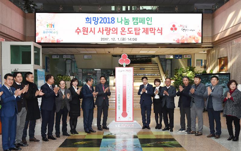 수원시는 1일 시청 로비에서 ‘사랑의 온도탑’ 제막식을 열고, 앞으로 2개월 간 진행될 ‘희망 2018 나눔 캠페인’의 시작을 알렸다. 수원시청 로비에 사랑의 온도탑이 설치된 것은 올해가 처음이다.