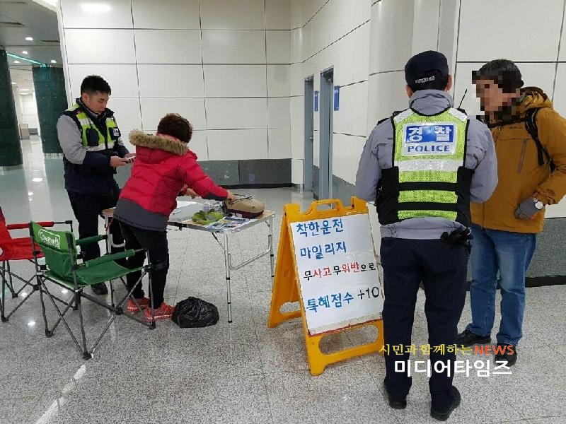 [미디어타임즈=문상수 기자] 인천남부경찰서(서장 조종림)은 지난 주말(2~3일)기간 동안 교통안전 선진문화 정착의 일환으로 인하대학교 및 인하역 일대에서 착한운전마일리지 캠페인을 실시했다. ‘착한운전 마일리지제’는 교통법규 준수를 서약하고 1년간 위반하지 않으면 행정처분을 감경해 주는 등 운전자에게 인센티브를 부여해 주는 제도이다.‘무위반·무사고 준수 서약‘을 하고 1년을 지키면, 10점씩 마일리지를 적립해 이후 운전자가 벌점 40점 이상을 받아 운전면허정지 처분 때, 누적된 마일리지만큼 벌점과 정지일수(1점에 1일)를 감경해주는 것으로 경찰서에 방문해 서약서를 작성한 후 가입을 할 수 있다.이에, 남부서는 바쁜 일정탓에 경찰서를 찾지 못하는 시민들을 위해 거리 캠페인을 통해 현장에서 서약서를 받고 신청서를 접수해주는 교통민원 서비스를 시작했다.