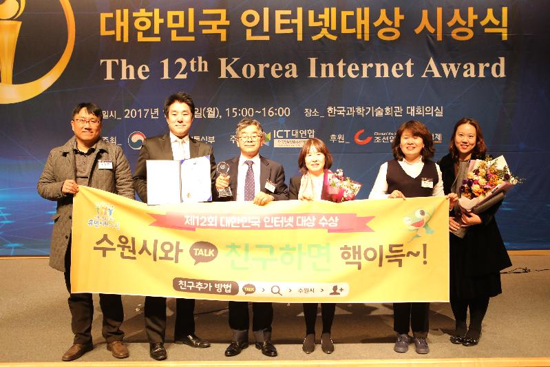 수원시가 제12회 대한민국 인터넷 대상 ‘인터넷 사회진흥 분야’에서 과학기술정보통신부장관상을 받았다. 시상식은 4일 서울 한국과학기술회관에서 열렸다.
