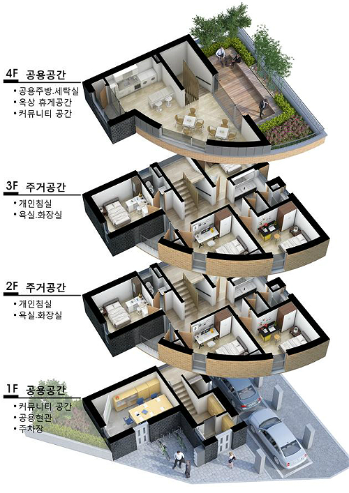 또한 정부에서 처음으로 지난 7월에 착공해 시범적으로 추진하는 서울시 장위동에 위치한 공유(셰어)형 임대주택(8가구)도 이번에 대학생을 대상으로 입주자를 모집해 공급할 계획이다. 공유형 임대주택에는 각 세대별로 별도의 방이 있고 공동공간에 공동주방, 거실 및 세탁실을 배치(4층)하고, 옥상에는 휴게공간도 마련했다.