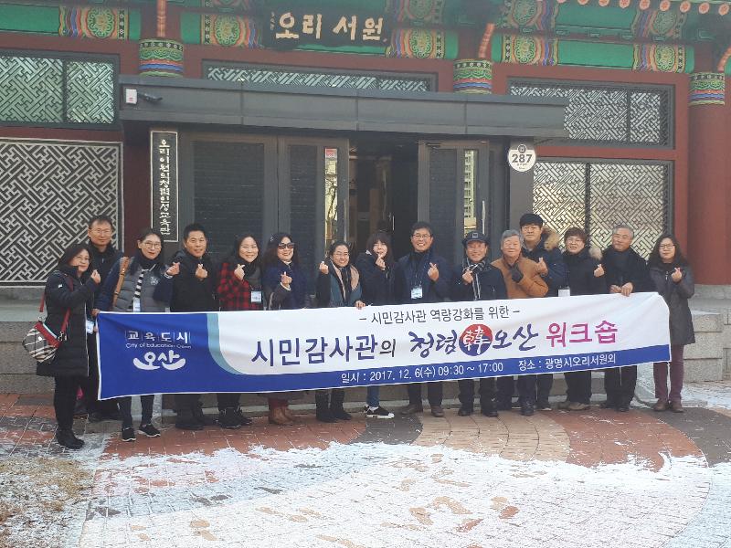 ‘시민감사관 워크숍’은 오산시의 시민감사관제도의 역량강화를 위한 워크숍으로 청렴의 대명사 오리 이원익 선생의 정신을 배우고 익히는 오리서원을 방문하여 시민감사관으로서의 임무 및 개선사항을 파악하고 시정에 함께 참여함으로써 시정이해의 폭을 넓히고 공감행정을 실현하고자 추진하게 되었다.