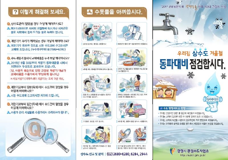 한편 광명시는 상수도 동파 예방을 위한 리플릿을 제작해 각 동 주민센터와 도서관 등 시민이 많이 이용하는 곳에 비치해 안내하고 있으며, 동파 취약지역에 대해서는 동파 예방 안내문을 배포할 예정이다.