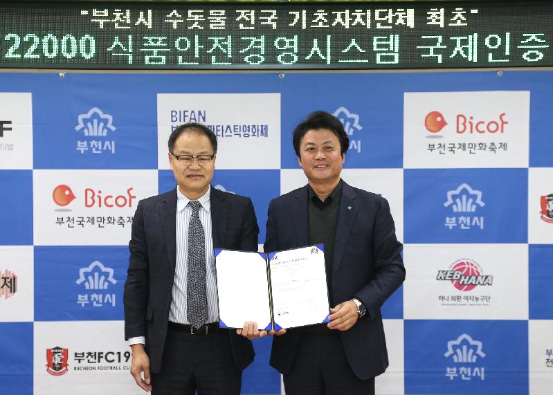 | 김만수 부천시장(오른쪽)과 이종호 (주)BSI그룹코리아 대표가 인증서를 들어보이고 있다. |