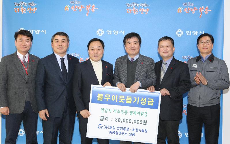 ㈜효성 안양공장 직원들은 지난 12일 안양시청을 방문하여 급여나눔운동을 통해 조성한 3천8백만원을 기부계단 후원성금으로 기탁했다.