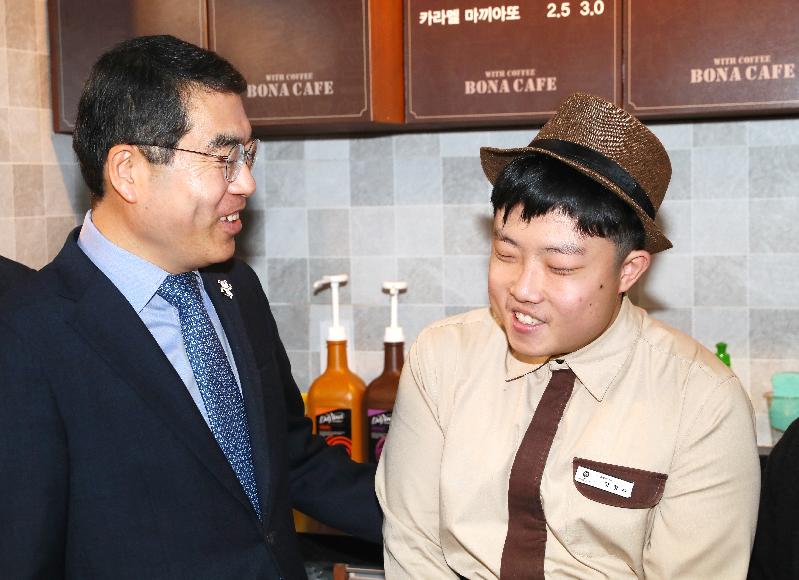 | 13일 광명시 차량등록사업소 민원실에서 열린 보나카페 9호점 개소식에서 양기대 광명시장이 .바리스타 청년을 격려하고 있다. |