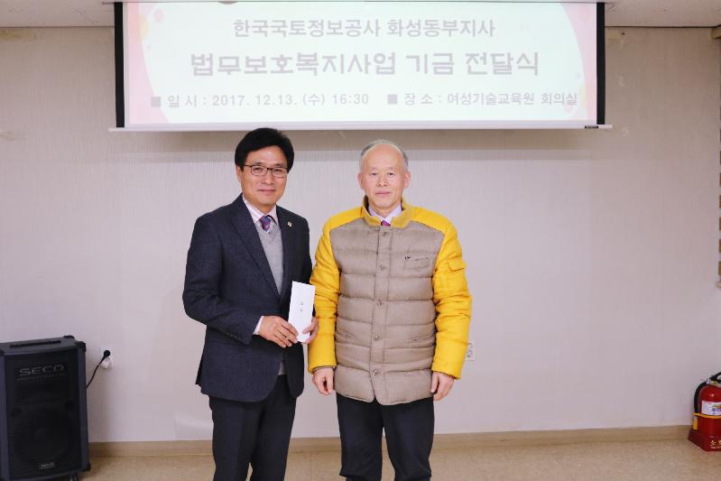 작년에 이어 두 번째로 전달된 기금은 한국국토정보공사 화성동부지사 차성복 지사장과 직원들이 연말연시를 맞이하여 어려운 이웃들을 위해 십시일반으로 모은 기금의 일부로, 여성보호대상자와 청소년보호대상자의 건강하고 행복한 자립과 사회복귀를 위해 소중하게 쓰여 질 예정이다.