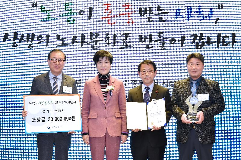[미디어타임즈= 김광한 기자] 수원시가 고용노동부 주관 ‘2017년 지역 노사민정 협력 유공 정부 포상’ 기초자치단체 부문 대상을 받았다. 시상식은 14일 서울 국민일보빌딩에서 열렸다.