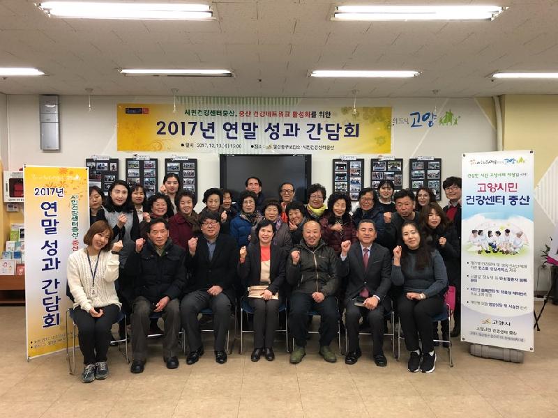 [미디어타임즈= 이옥수 기자] 고양시(시장 최성) 일산동구보건소는 지난 13일 시민건강센터 중산에서 중산 건강네트워크회원, 지역의료기관 관계자, 지역단체대표 및 주민 등 40여 명이 참석한 가운데 ‘2017년 시민건강센터 중산, 건강네트워크 연말 성과 간담회’를 개최했다.