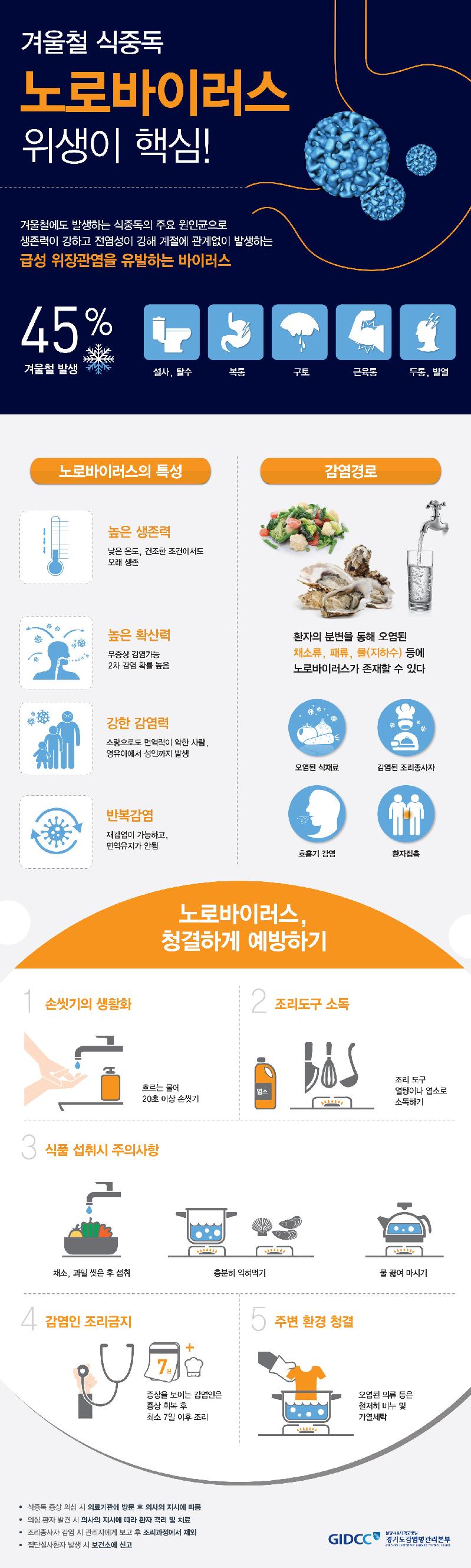 노로바이러스감염증은 평소 올바른 손씻기, 음식 익혀먹기, 물 끓여 마시기 등으로 예방할 수 있으며 발생 후에는 환자 구토물에 오염된 물품 또는 접촉한 환경 및 화장실 등에 대한 소독을 시행해야 한다.